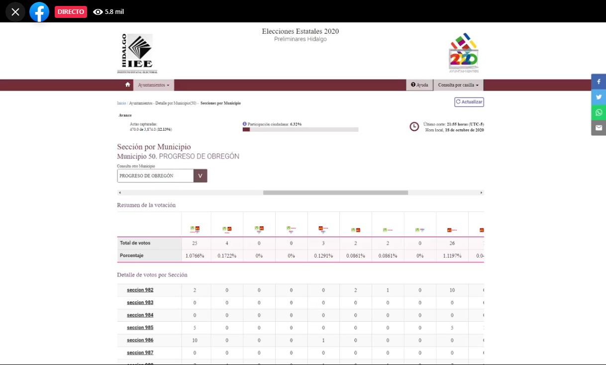 Ante ello, el IEEH determinó habilitar una transmisión en vivo por Facebook, en la que personal del organismo va mostrando y leyendo el avance en la captura de datos por cada municipio.