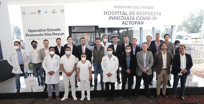 Esta tarde, en el Hospital de Respuesta Inmediata COVID-19 de Actopan, el gobernador del Estado de Hidalgo, Omar Fayad Meneses, dió inicio al Operativo Escudo Protocolo Vita Deyun, con el que atenderán las afectaciones graves causadas por el coronavirus.