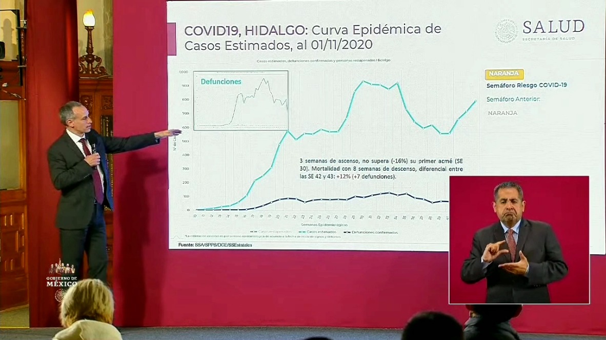El funcionario federal detalló que el comportamiento de la pandemia en Hidalgo ha sido de una meseta, luego un ascenso para llegar a una segunda meseta que se registró entre las semanas 32 y 36, seguido de un descenso y hasta las últimas tres semanas registró una fase de ascenso, que indicó, se encuentra 16 puntos porcentuales debajo de su primer acmé.