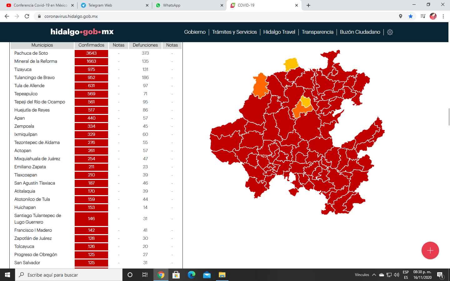 De acuerdo con la Secretaría de Salud de Hidalgo, Pachuca ya sobrepasa los 3 mil contagios siendo el epicentro de la pandemia en el estado, seguido de Mineral de la Reforma con mil 663 contagios, Huejutla con 975 y Tulancingo con 952 infecciones del virus SARS CoV-2.