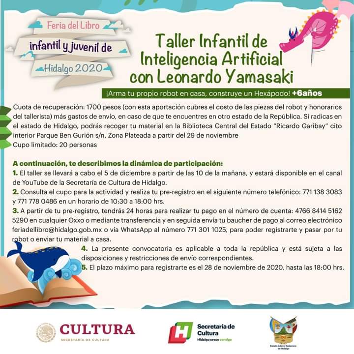 La Feria del Libro Infantil y Juvenil (FLIJH) 2020 invita a los niños y jóvenes hidalguenses a participar en el “Taller Infantil de Inteligencia Artificial” que se realizará en el marco de la feria y será impartido en las instalaciones de la biblioteca Ricardo Garibay por Leonardo Yamasaki, profesor e investigador de la Universidad Autónoma de Chiapas (UNACH).