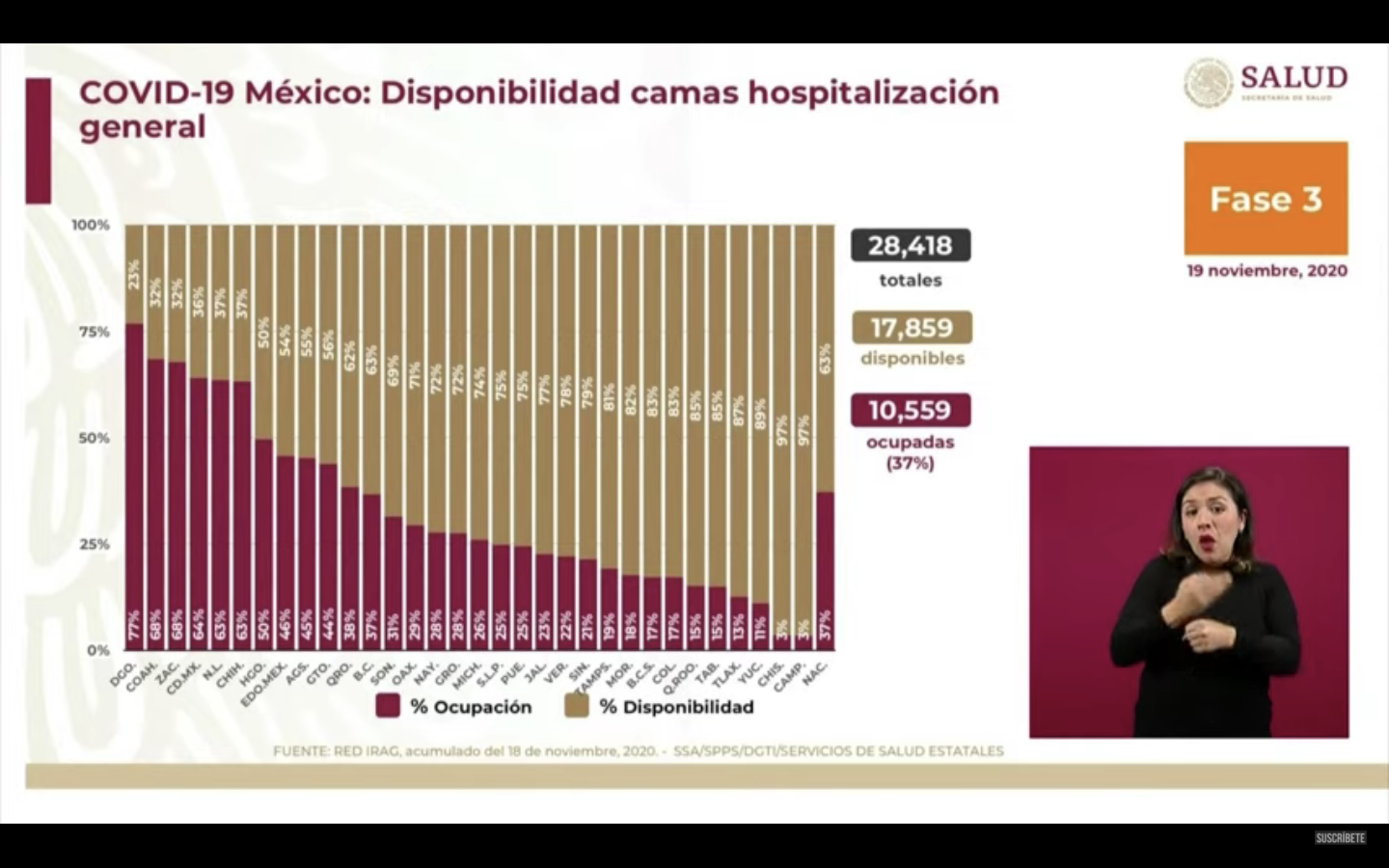 De acuerdo con la Secretaría de Salud, México registra un total de un millón 19 mil 543 casos confirmados del virus SARS CoV-2; 384 mil 718 casos sospechosos; 100 mil 104 defunciones y 766 mil 361 recuperados del virus.