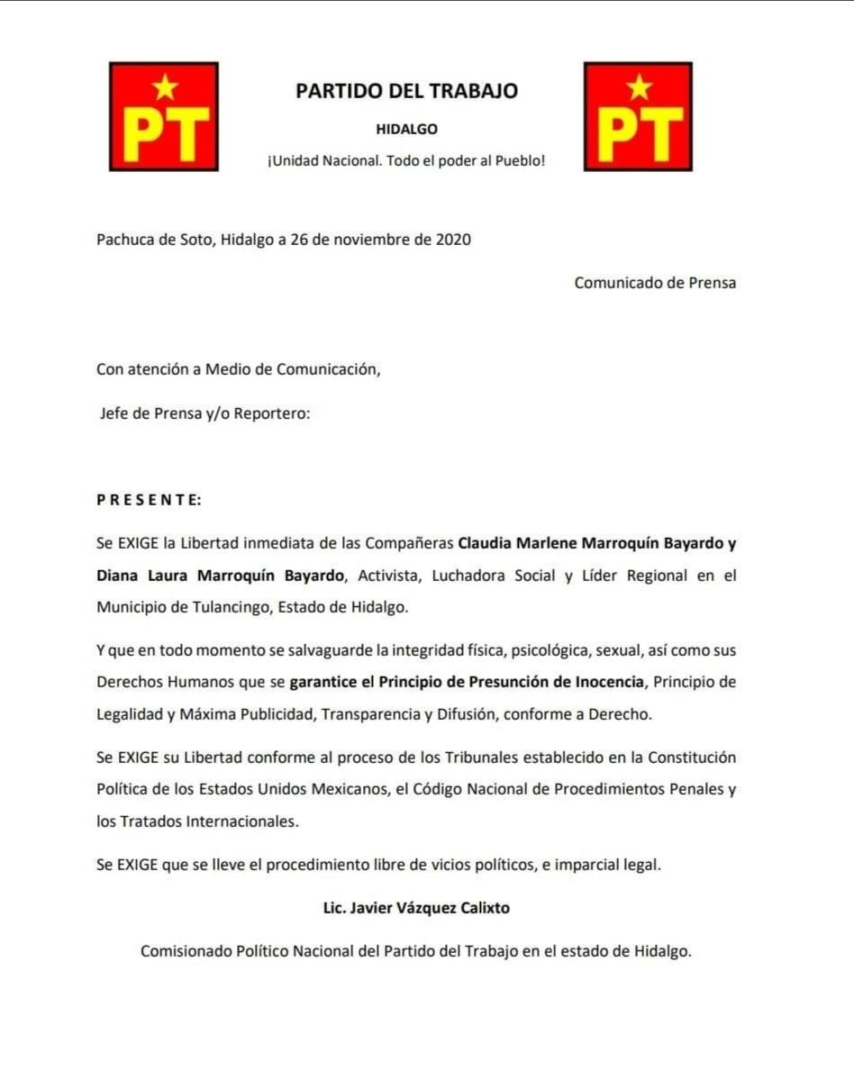 A través de un comunicado, Javier Vázquez Calixto, Comisionado Político Nacional del Partido del Trabajo (PT) en Hidalgo, exigió la libertad inmediata de su militante Diana Laura Marroquín Bayardo y de Claudia Marlene Marroquín Bayardo, quienes fue detenidas este mediodía por el homicidio del empresario José Francisco Marroquín Sosa.