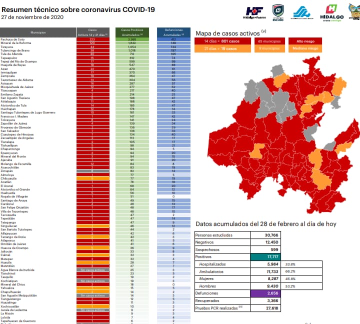 De acuerdo con la Secretaría de Salud federal (SSA), hasta este 27 de noviembre Hidalgo registra un acumulado de 18 mil 583 casos confirmados por COVID-19, de los cuales 688 son activos. Además, se tienen detectados 4 mil 396 casos sospechosos del virus, mientras que las defunciones suman un total de 2 mil 669 defunciones.
