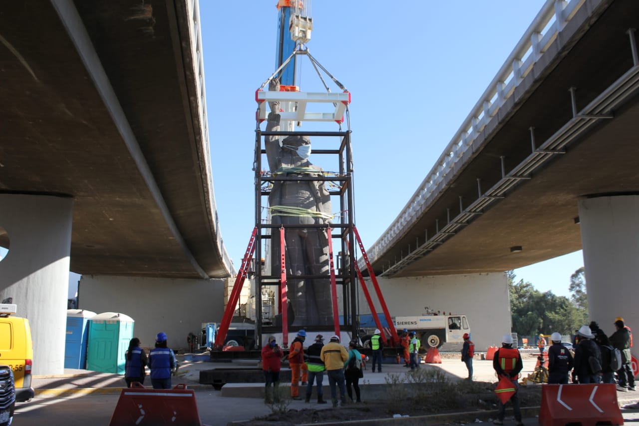 Para la maniobra se utilizó una grúa de capacidad de 450 toneladas con la cual se recorrió el monumento, se giró 90 grados, se mantuvo suspendido y con otra grúa de 200 toneladas se retiró el sistema de rieles y gatos, posteriormente la grúa de 450 toneladas lo posicionó en el piso. Se calcula que el monumento tiene un peso de 110 toneladas.