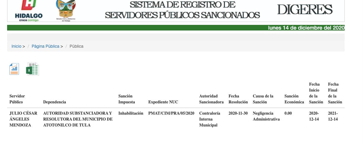 Por violentar el procedimiento de contratación conforme a los dispuesto en la Constitución Política de los Estados Unidos Mexicanos y la Ley de Arrendamientos y Servicios del Sector Público del Estado de Hidalgo, quien se desempeñara como presidente municipal de Atotonilco de Tula, en el periodo 2016-2020, Julio César Ángeles Mendoza, resultó inhabilitado por el término de un año para desempeñar empleos, cargos o comisiones en el servicio público y para participar en adquisiciones, arrendamientos, servicios u obras públicas.