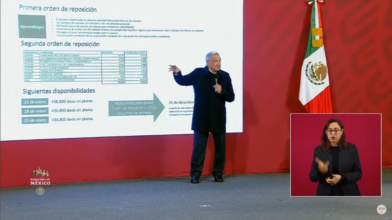 Además, dio a conocer que la tercera orden de reposición constará de 436 mil 800 dosis con las que se vacunará a los médicos del resto de los estados y con la cuarta orden de reposición de igual número de vacunas, se aplicará la segunda vacuna al personal médico de Hidalgo y de las entidades donde se aplicaron los dos primeros lotes, debido a que la inmunización con la vacuna creada por Pfizer-BioNTech consta de dos dosis.