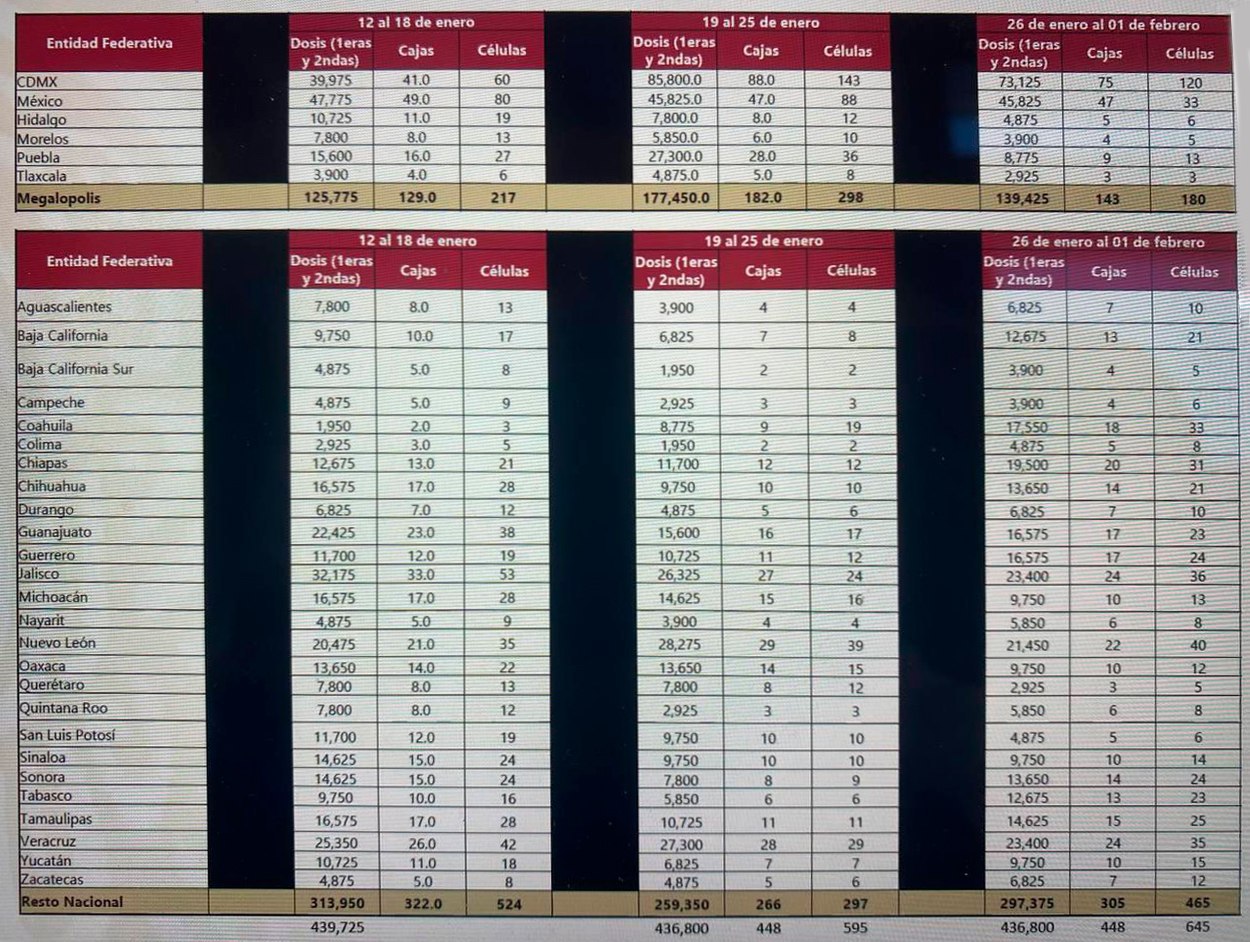 En la tabla se prevé un tercer envío entre el 26 de enero y el 1 de febrero de cuatro mil 875 dosis.