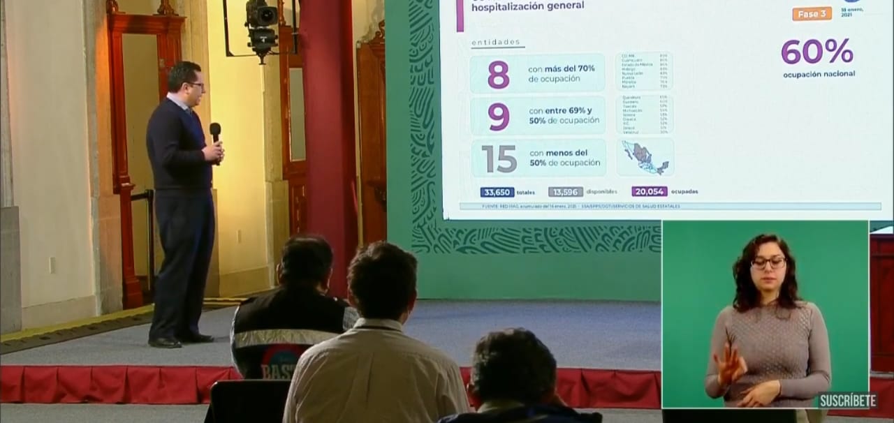 Jesus Alomía, director general de Epidemiología, informó durante la conferencia de prensa vespertina desde Palacio Nacional, que Hidalgo continúa registrando un 83 por ciento de ocupación hospitalaria; asimismo, señaló que el estado deberá entrar en proceso de reconstrucción y expansión hospitalaria por el riesgo de saturación hospitalaria.