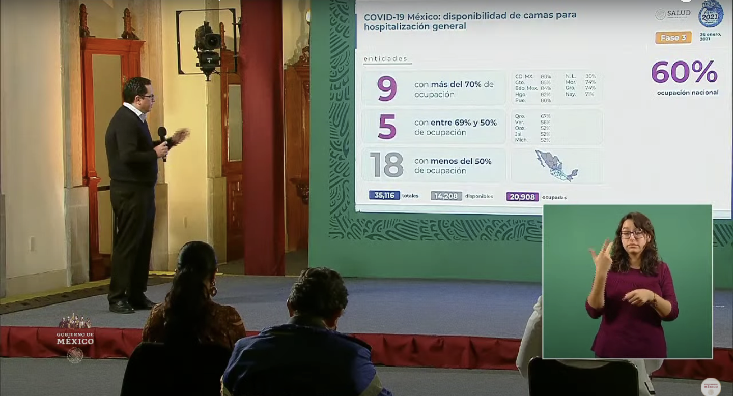 Jesús Alomía, director general de Epidemiología, informó durante la conferencia de prensa vespertina desde Palacio Nacional, que Hidalgo ha registrado un 82 por ciento de ocupación hospitalaria y un 53 por ciento de ocupación de camas con ventilador en las últimas 48 horas.