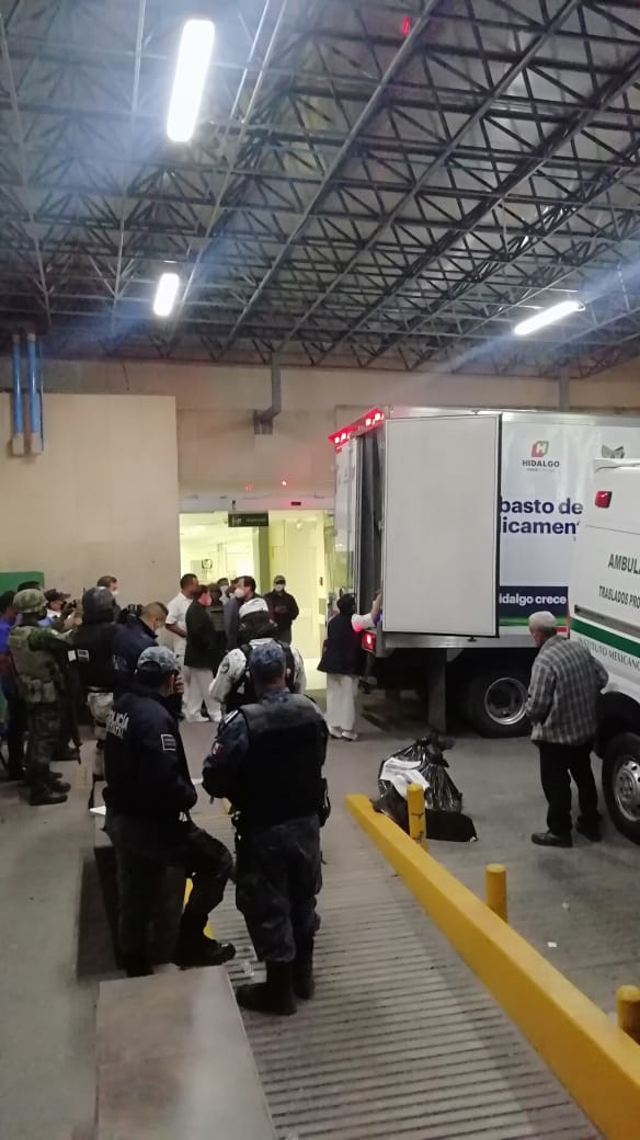 Elementos de la Guardia Nacional y Seguridad Pública del Estado acompañaron en su recorrido al vehículo de la Secretaría de Salud de Hidalgo (SSH) que trasladó el biológico a los hospitales de la SSH, el General de Tula-Tepeji y el Integral de Cinta Larga, así como a los del Instituto Mexicano del Seguro Social No.5 de Tula y No.6 de Tepeji del Río.