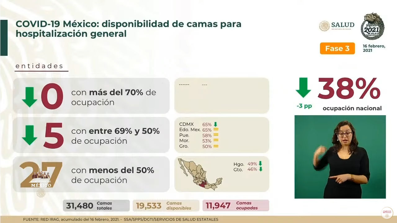 El director general de Epidemiología, Jesús Luis Alomía Zegarra, expuso en la conferencia de prensa vespertina que el registro porcentual a nivel nacional ha descendido a un 38 por ciento; sumándose Hidalgo a las entidades que registran menos del 50 por ciento de ocupación hospitalaria.