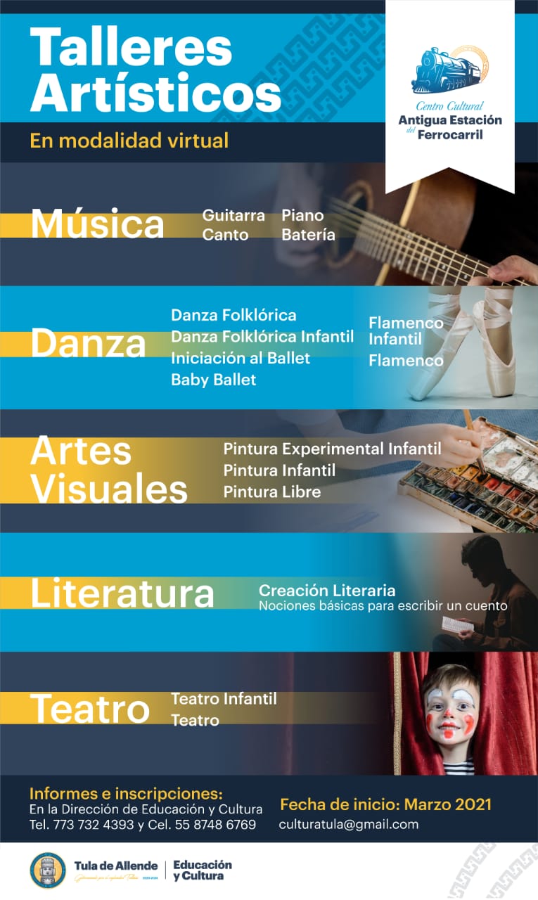 El gobierno municipal de Tula, abrió inscripciones para una serie de talleres artísticos virtuales que iniciarán en marzo. Se ofrecen clases de literatura, danza, pintura y música entre otros, que serán impartidas por talentos tulenses.