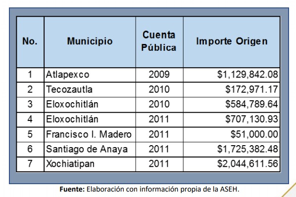 Se trata de los ayuntamientos de Atlapexco, que debe cobrar un importe de un millón 842 mil pesos que no comprobaron José Nochebuena Hernández y Clemente Salazar Olivares (2009); por su parte, Tecozautla debe recuperar de la cuenta pública 2010 172 mil 971 pesos que no solventó Pedro Geremías Viruel Ramírez.