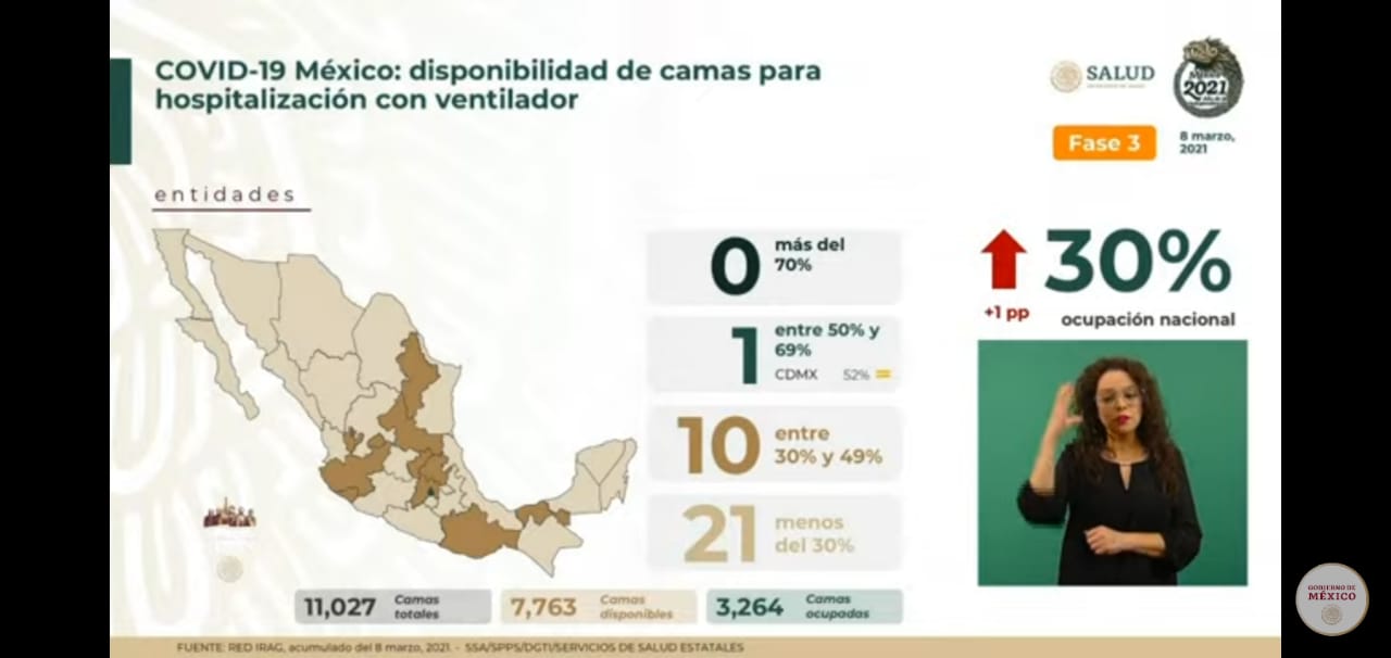 Esto, ya que son 26 entidades federativas -entre ellas Hidalgo-, las que registran más del 70 por ciento de disponibilidad en camas generales para pacientes de COVID-19.