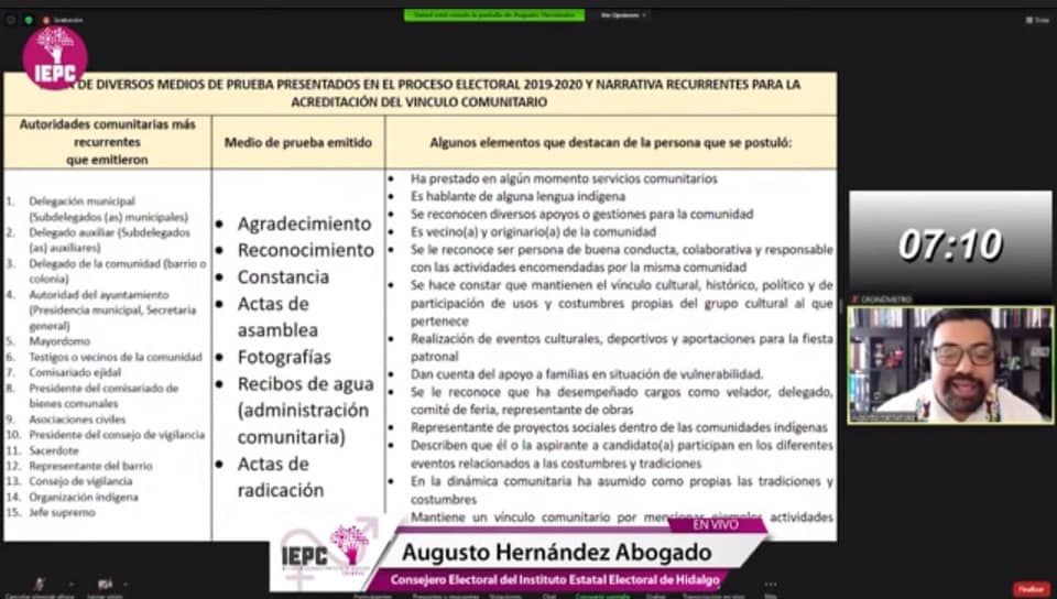 El Instituto Estatal Electoral de Hidalgo (IEEH), participó en el Foro “Proceso Electoral 2021: Hacia una representación política incluyente en Chiapas”, con el tema “Retos y Desafíos para garantizar la representación indígena sin usurpación. Caso Hidalgo 2020”