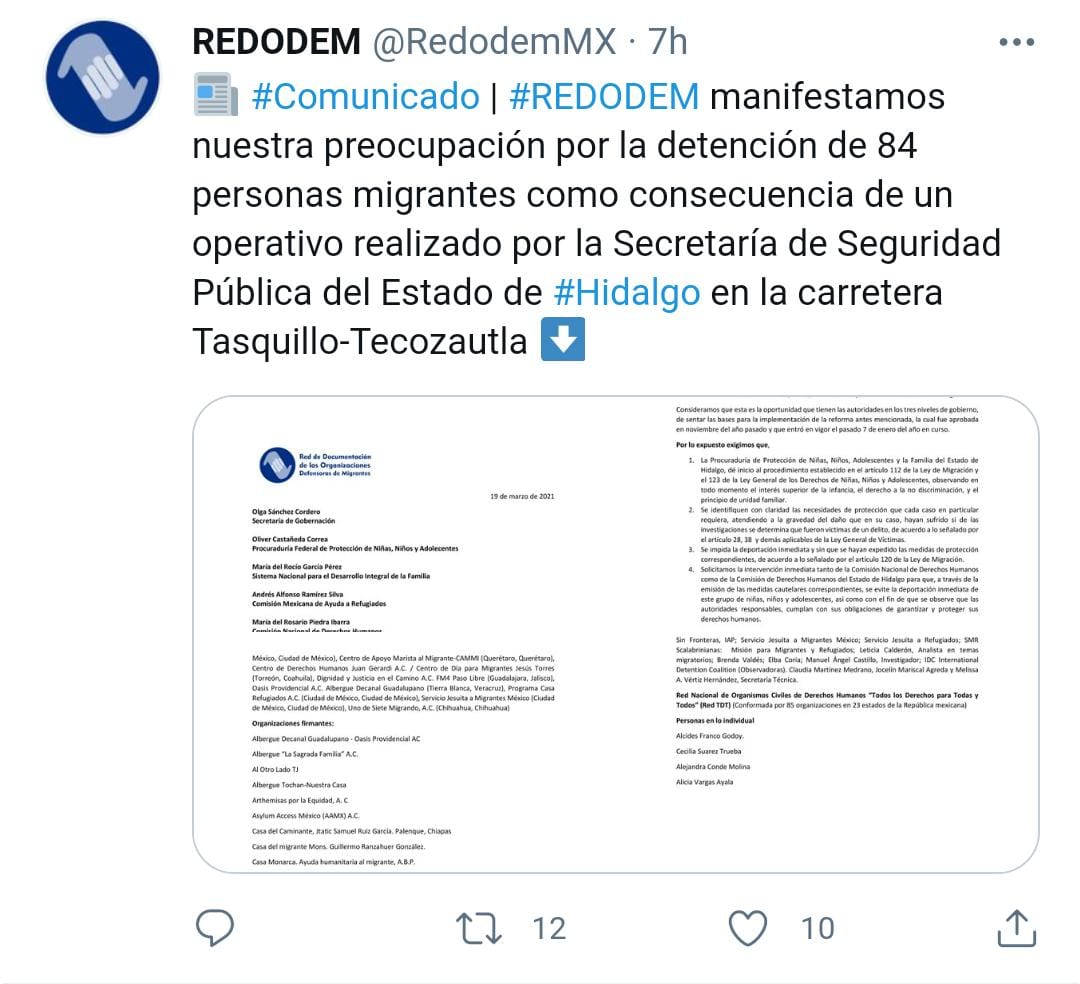 La Red de Documentación de las Organizaciones Defensoras de Migrantes (REDODEM) manifestó en un comunicado su preocupación por la situación de un grupo de migrantes, ciudadanos de Guatemala, El Salvador y Honduras, entre ellos 63 menores, que fueron detenidos en Tecozautla y están detenidos en la delegación de Tula, de la Fiscalía General de la República (FGR), y exige se impida su deportación inmediata.