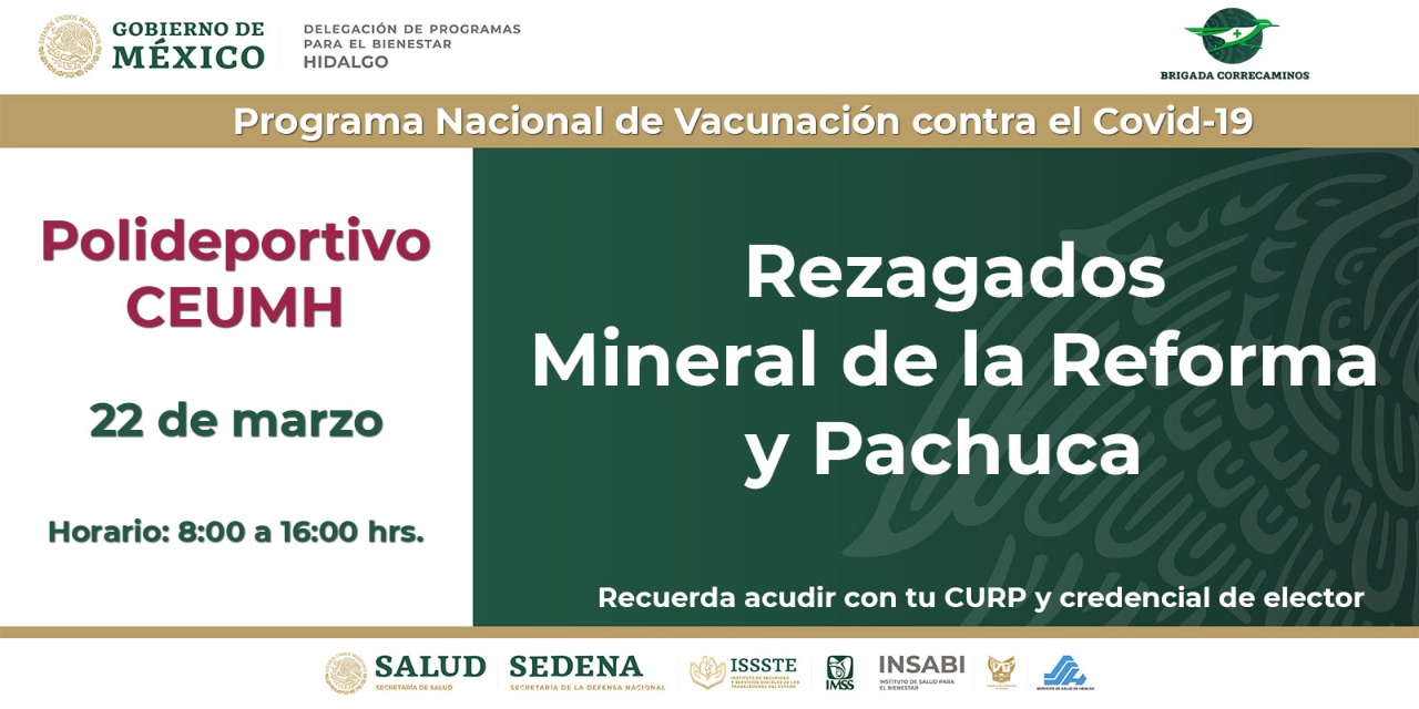 La Delegación de Programas para el Bienestar anunció que el día de hoy, lunes 22 de marzo, continuará la vacunación para rezagados de los municipios de Pachuca y Mineral de la Reforma en el mismo horario establecido por cada demarcación, correspondiendo de las 8:00 a las 16:00 horas.