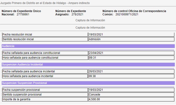 Con base en las listas del Consejo de la Judicatura federal, el exalcalde presentó una demanda de amparo registrada bajo el número de expediente 278/2021, en contra del Juez de Control del Cuarto Circuito Judicial de Huichapan, con fecha 19 de marzo de 2021.