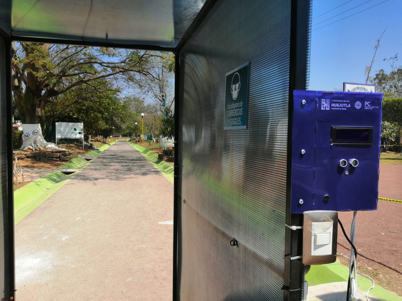 Jóvenes huejutlenses automatizaron una cabina que se encuentra en la entrada al Parque Ecológico Municipal, para que cheque la temperatura ambiente y corporal, esparza el líquido desinfectante y contabilice el número de personas que ingresan a dicho espacio.