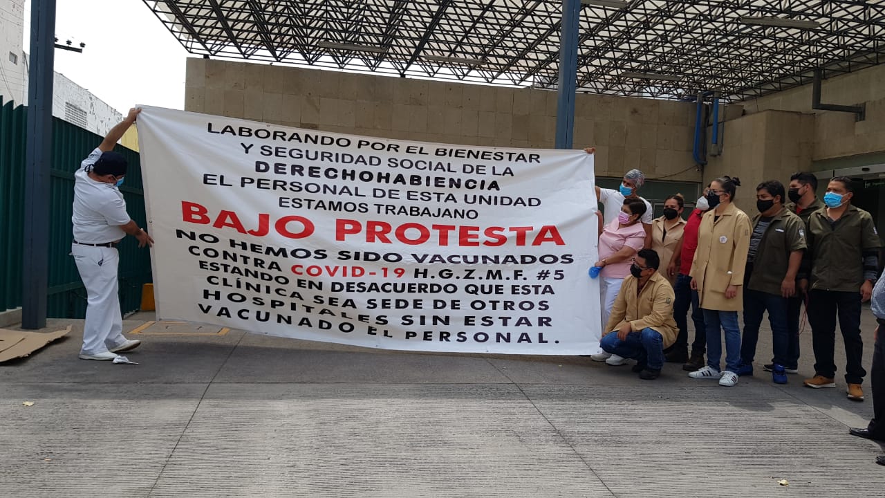 “Laborando por el bienestar y seguridad social de la derechohabiencia, el personal de esta unidad estamos trabajando bajo protesta. No hemos sido vacunados contra COVID-19”, señalan las lonas que colocaron al exterior del hospital, que también menciona que están “en desacuerdo que esta clínica sea sede de otros hospitales sin estar vacunados el personal”.