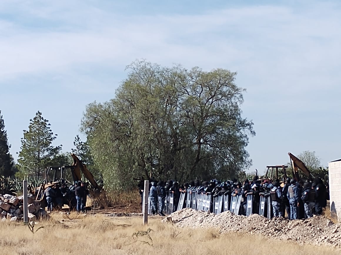 Esta mañana, en el municipio de Tula de Allende y con apoyo de al menos 250 policías, un actuario realizó una diligencia judicial de deslinde de terrenos como parte de un juicio de desalojo por invasión contra un grupo de familias que habitan de manera irregular un terreno propiedad del Ejido de San Pedro Alpuyeca.