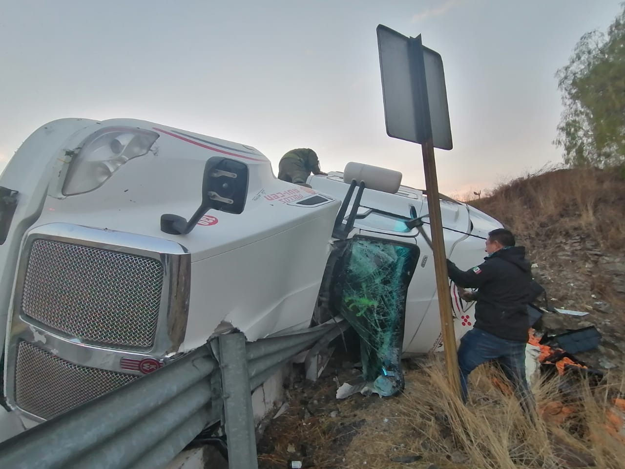 En el lugar bomberos y paramédicos del municipio de Tepeji del Río Caminos y Puentes Federales (Capufe) constataron que en la pronunciada curva se encontraba volcado el automotor. Al operador lo encontraron dentro de la unidad ya sin vida, prensado por una barra de contención metálica de la pista federal.