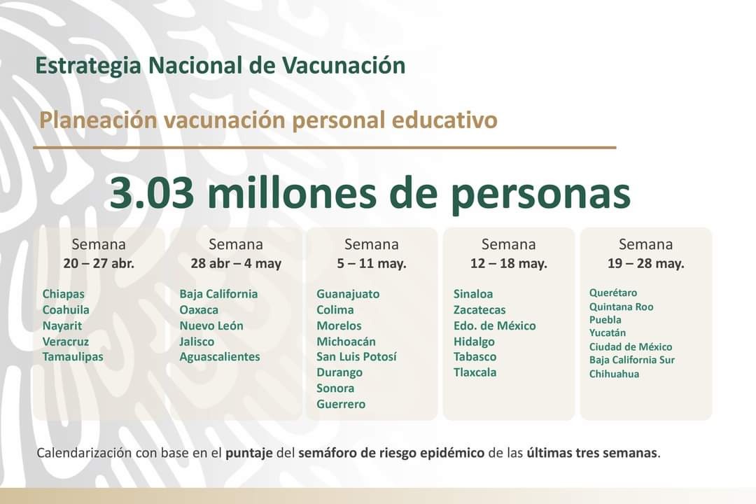 “Una vez vacunados las y los docentes y personal educativo, después de dos semanas, se desarrollarán los anticuerpos esperados para la protección inmunológica, haciendo posible la reintegración a clases presenciales. Por lo que el primer bloque, podrá reabrir cerca del 15 de mayo y a mediados del 15 de junio, podrán reintegrarse los del último bloque a clases presenciales”, informó López-Gatell.