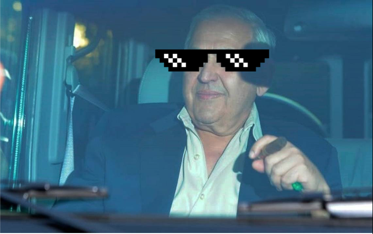 Al salir, abordó una camioneta blindada Mercedes Benz negra, el empresario vestía traje gris con camisa blanca, sin corbata; iba sonriente y con un puro en la mano izquierda.