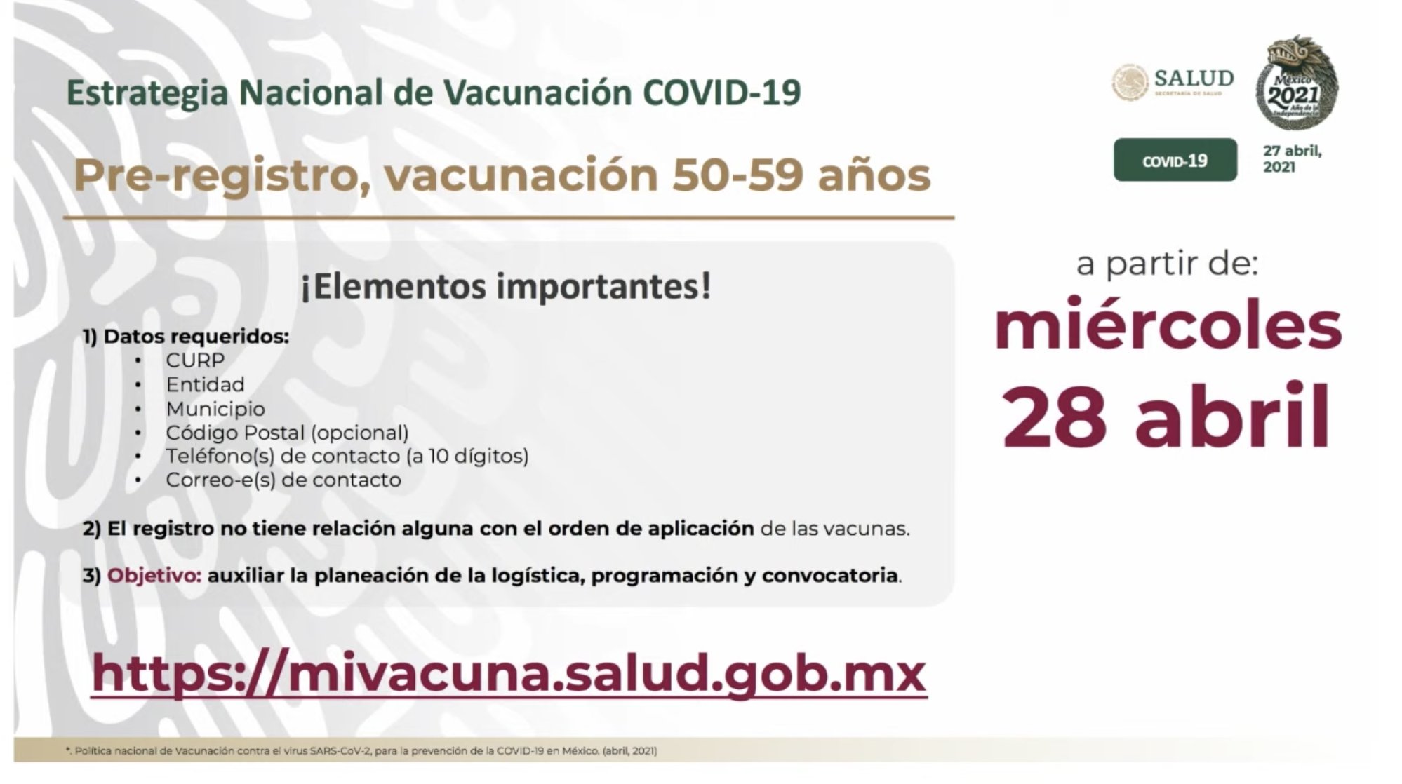 A partir de mañana miércoles 28 de abril comenzará en México el registro para la vacunación de personas de 50 a 59 años contra COVID-19.