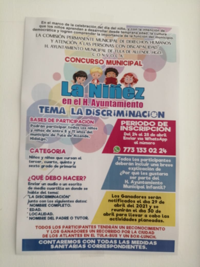 El Ayuntamiento de Tula de Allende está convocando a los niños de entre 8 y 11 años a participar en el concurso municipal “La Niñez en el Ayuntamiento”, que se llevará a cabo en marco de la celebración del Día del Niño, con la intención de que aprendan a desarrollar desde temprana edad la cultura democrática y deliberen sobre el tema de la discriminación.