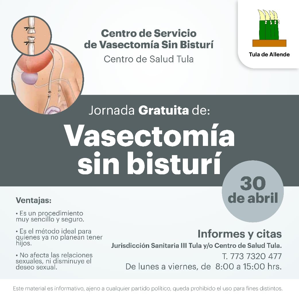 La alcaldía de Tula convocó a los varones a participar en la Tercera Jornada de Vasectomía sin Bisturí 2021, que llevarán a cabo la Jurisdicción Sanitaria número 3 de Tula y la Secretaría de Salud el día 30 de abril de 2021, a partir de las 8:00 am y hasta las 3:00 pm, en el Centro de Salud de Tula.