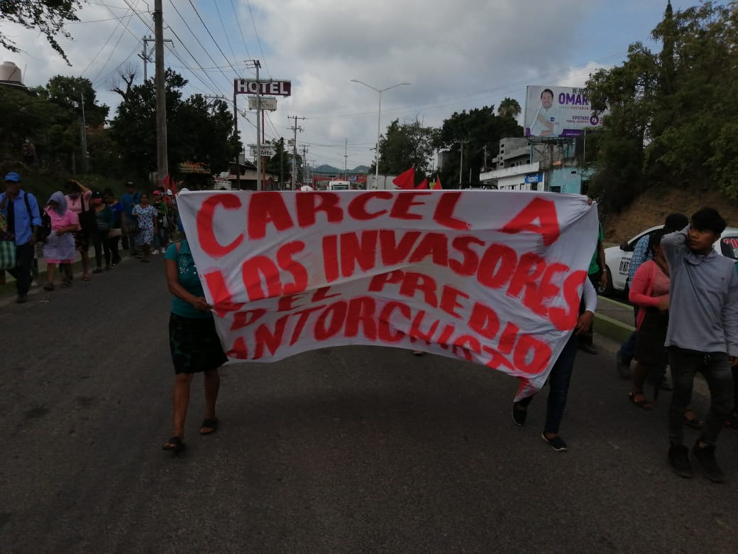 Integrantes de Antorcha Campesina marchan por las calles de la ciudad de Huejutla para exigir la intervención de las autoridades correspondientes en el asunto que los relaciona con la invasión de un terreno que aseguran es de su propiedad.