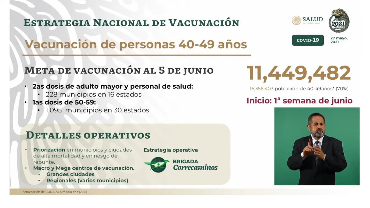 Con el presidente @lopezobrador_ anunciamos que el 1 de junio iniciará la vacunación a personas de 40 a 49 años. Se pretende inmunizar a 11 millones 442 mil 482 personas. El registro está abierto en https://t.co/g8mJgOVB0z. pic.twitter.com/6emoSlxPtg