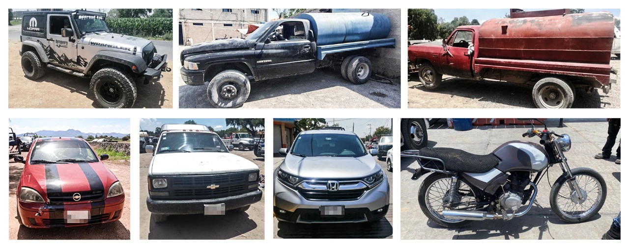 Y se localizaron y recuperaron, además, cinco vehículos con reporte de robo vigente e intervinieron a dos personas con presunta marihuana y droga sintética.