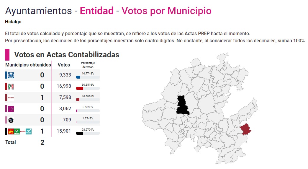De acuerdo con el Programa de Resultados Electorales Preliminares, el Movimiento de Regeneración Nacional (Morena) y su coalición Juntos Haremos Historia ganaron las presidencias municipales de Acaxochitlán e Ixmiquilpan que se disputaban este 6 de junio, las cuales eran parte del proceso electoral extraordinario del 2020-2021.