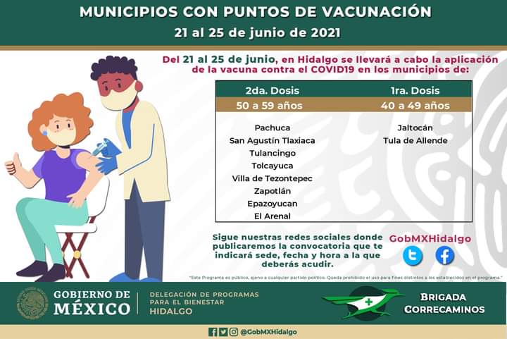 Esta mañana, la Delegación de Programas para el Bienestar de Hidalgo, anunció que del 21 al 25 junio del presente año, dará inicio la aplicación de la segunda dosis de la vacuna contra COVID-19 a adultos de 50 a 59 años en 8 municipios más de la entidad, mientras que dos comenzarán la primera dosis en adultos de 40 a 49 años.