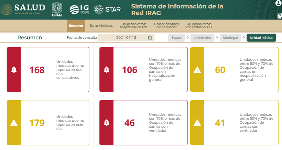 De acuerdo con el Sistema de Información de la Red IRAG, el Hospital General de Cd. Sahagún presenta una saturación en pacientes de COVID-19; así como el Hospital de Respuesta Inmediata (inflable) ubicado en la capital Hidalguense y 6 unidades más registran índices arriba del 50 y 60 por ciento de ocupación hospitalaria.