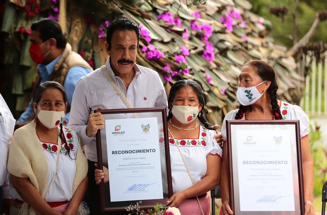 El gobernador Omar Fayad Meneses entregó el nombramiento de Embajadoras de la cocina hidalguense 2021 a las cocineras tradicionales otomíes Claudia Hernández, Porfiria Rodríguez y Martha Gómez, quienes ganaron el concurso gastronómico nacional ¿A qué sabe la patria?
