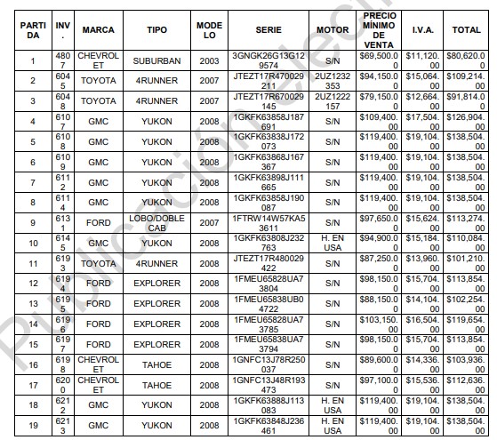 Su precio en conjunto es de 3 millones 576 mil 333 pesos, con IVA incluido. Sin embargo, por unidad van desde los 80 mil 620 pesos que cuesta una Suburban modelo 2003, hasta los 205 mil 256 pesos en los que está valuada una Tahoe modelo 2012.