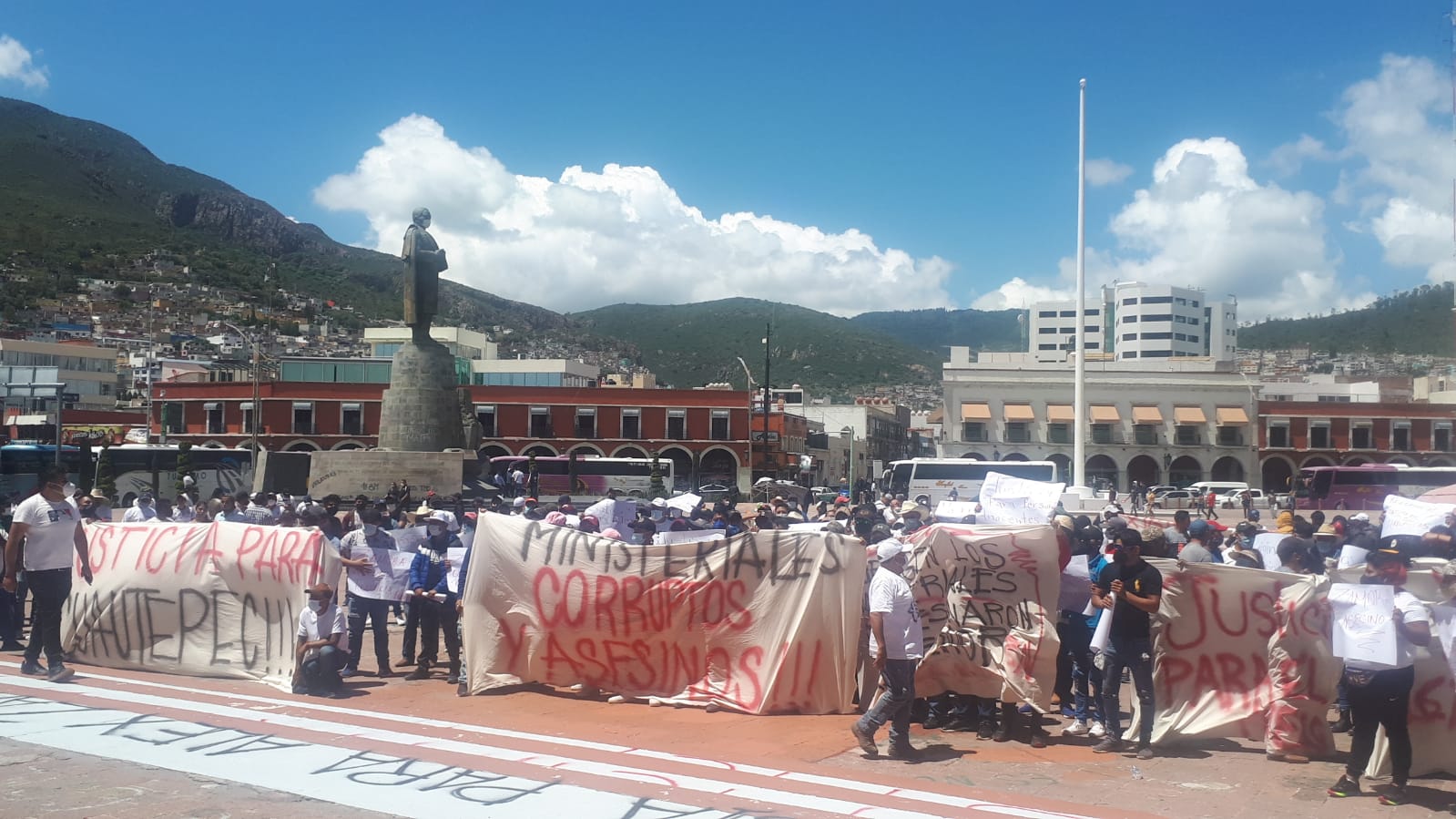 En la Plaza Juárez de Pachuca los manifestantes colocaron pancartas, realizaron pintas y gritaron consignas para demandar “Justicia para Alex y su familia”. Un grupo de manifestantes amenazaba con ingresar al inmueble con palabras altisonantes, sin embargo, los gritos cesaron tras la indicación de una persona que encabezaba la manifestación.