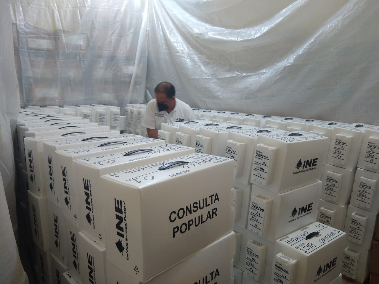 Oscar Ávila Aldana, consejero presidente del INE en la Sierra y Huasteca, informó que cada paquete contiene papeletas, lista nominal, líquido indeleble, marcadora de credencial, actas, carteles y papelería diversa, además de mamparas y urnas.