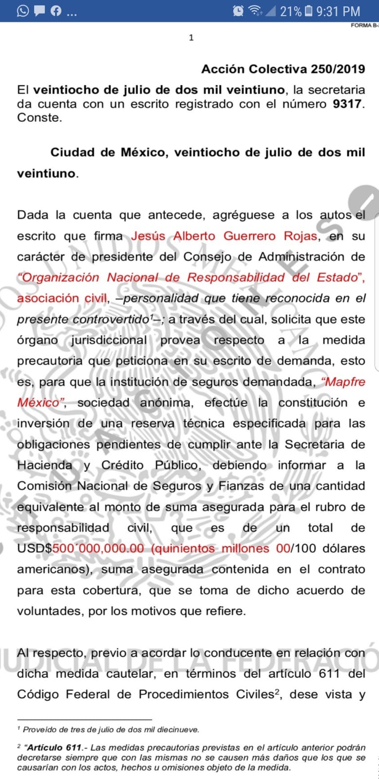 Jesús Alberto Guerrero Rojas, presidente de la Organización Nacional de Responsabilidad del Estado(ONRE) A.C., y quien encabeza la demanda, informó que mediante auto de fecha 28 de julio de 2021 el Juez ordenó a la institución de seguros demandada Mapfre México que “efectúe la constitución e inversión de una reserva técnica especificada para las obligaciones pendientes de cumplir ante la Secretaria de Hacienda y Crédito Público”.