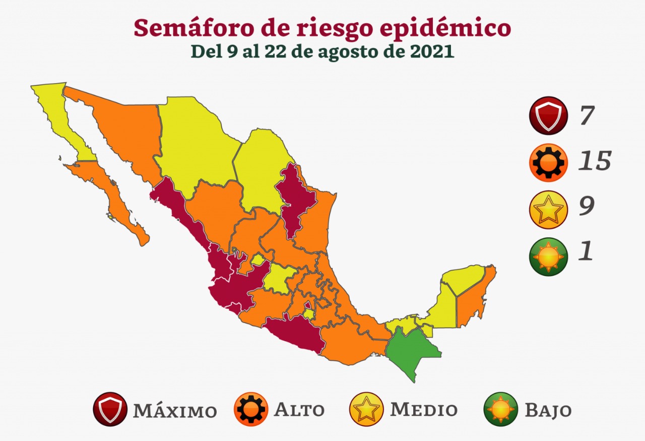 Esta noche, la Secretaría de Salud federal, dio a conocer la actualización del semáforo epidémico, donde se mostró que Hidalgo permanecerá en color naranja junto a 14 entidades más los próximos 15 días, que comprenden del 9 al 22 de agosto; a su vez, se registran 6 entidades más en color rojo a causa del ascenso de contagios.