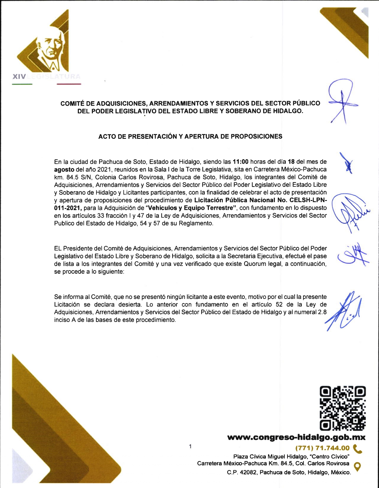 El Comité de Adquisiciones, Arrendamientos y Servicios del Sector Público del Poder Legislativo declaró desierta la licitación pública CELSH-LP-001-2021, por medio de la cual se buscaba la adquisición de tres vehículos para el Poder Legislativo de Hidalgo.
