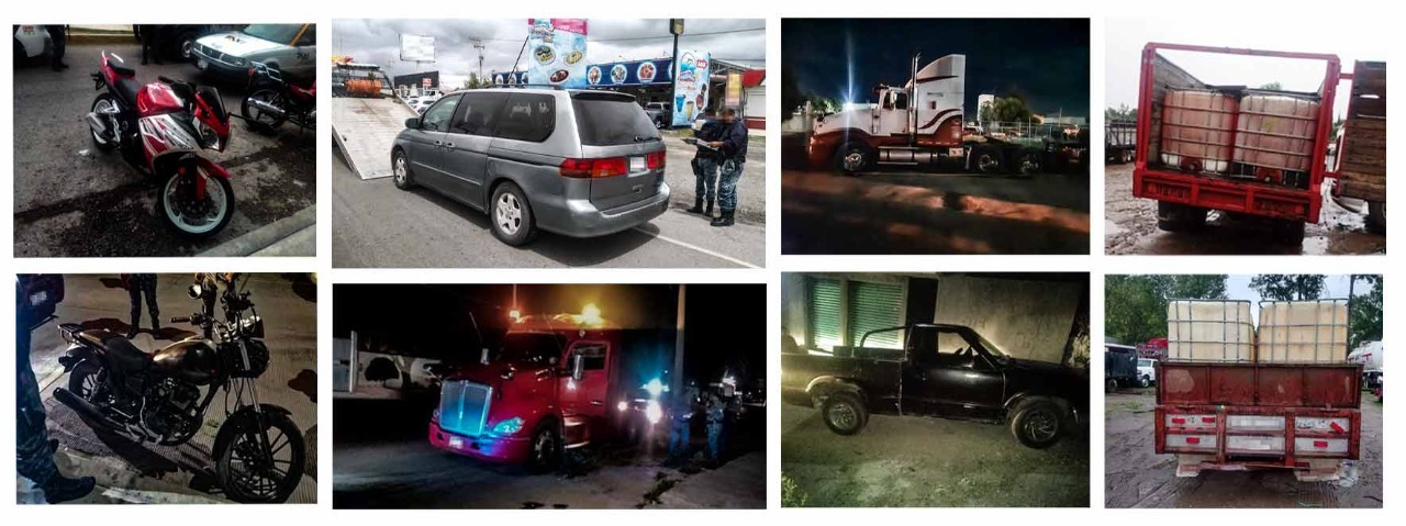 Esta mañana la Secretaría de Seguridad Pública de Hidalgo (SSPH) informó que, tras desplegar operativos en distintos puntos de la entidad, se llevó a cabo la recuperación de 6 vehículos con reporte de robo y dos más con hidrocarburos, los cuales fueron interceptados en capital hidalguense, así como en la comunidad de Chapatongo.