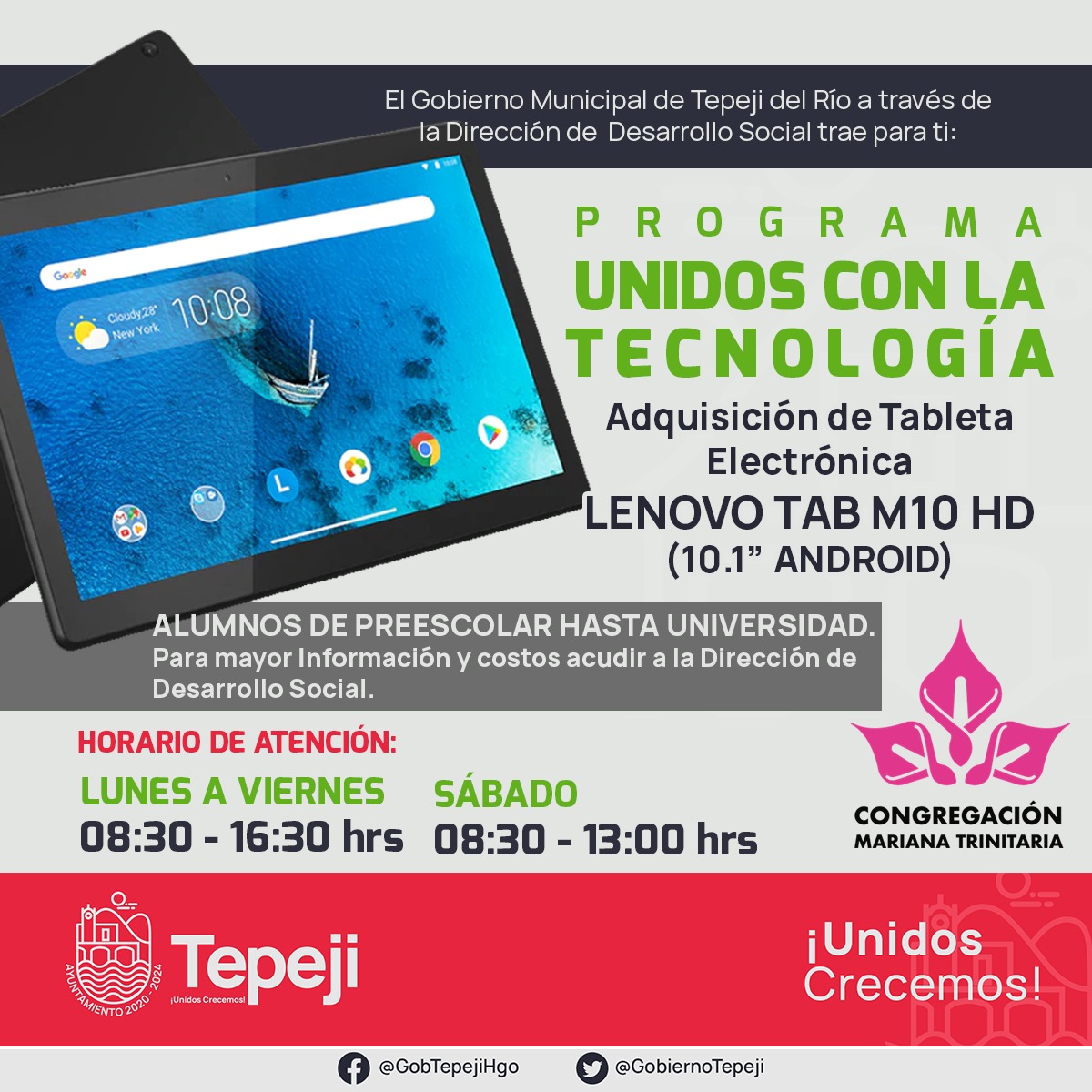 El gobierno municipal de Tepeji del Río, dio a conocer que junto con la asociación María Trinitaria, llevan a cabo el programa “Unidos con la Tecnología”, a través del cual la población en edad escolar desde preescolar hasta universidad, pueden adquirir una tableta electrónica a bajo costo.