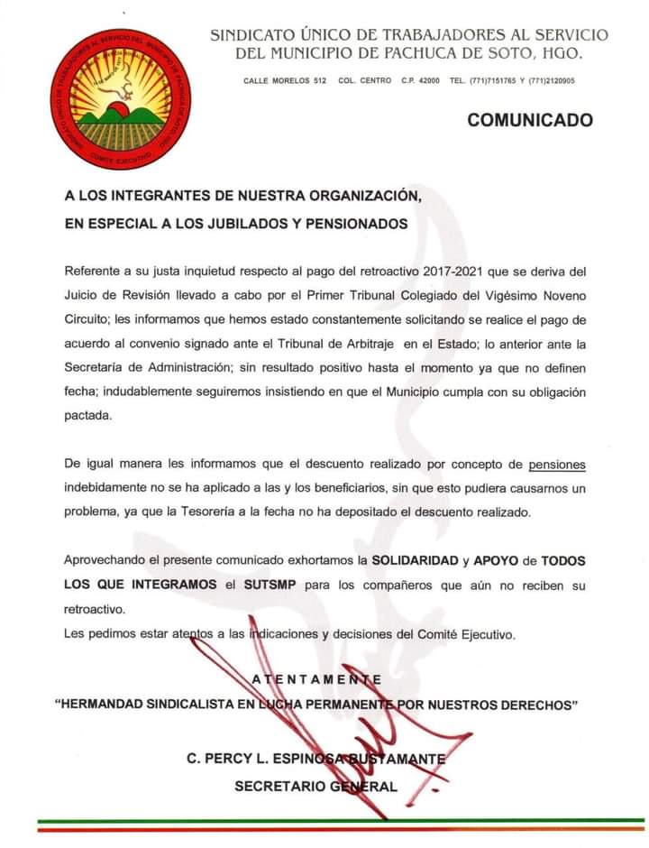 Esta tarde, a través de un comunicado, el Sindicato Único de Trabajadores al Servicio del Municipio de Pachuca (Sustmp) pidió al ayuntamiento municipal el cumplimiento del pago retroactivo correspondiente del 2017-2021 derivado del Juicio de Revisión, llevado a cabo por el Tribunal Colegiado del Vigésimo Noveno Circuito.