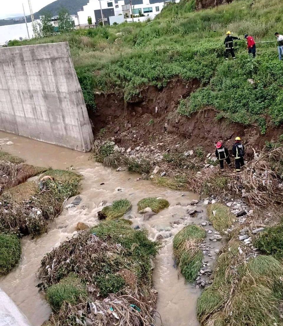 Tras corroborar que el hombre se encuentra sin vida, los elementos de bomberos realizan las labores del rescate del cadáver de un hombre de una edad de 30 a 40 años de edad, quien solo vestía un pantalón de mezclilla y está atorado entre la maleza.