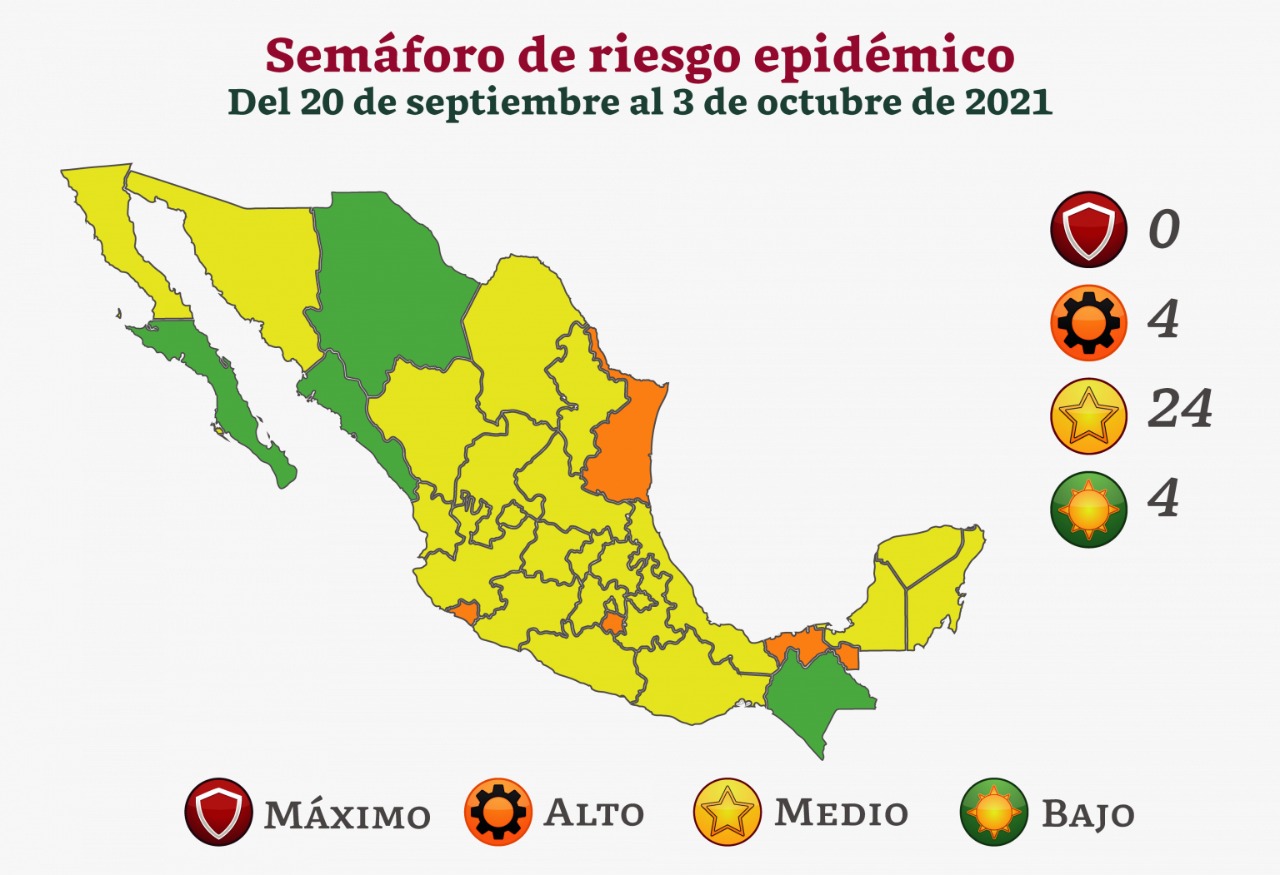 Esta noche la Secretaría de Salud anunció la actualización del semáforo epidemiológico, la cual regresa a Hidalgo a color amarillo los próximos 15 días, que comprenden del 20 de septiembre al 3 de octubre, indicando un riesgo máximo de contagio medio. Sin embargo, esto no significa que se modifiquen las medidas de seguridad, ya que aún ante el color rojo los establecimientos pueden permanecer abiertos.